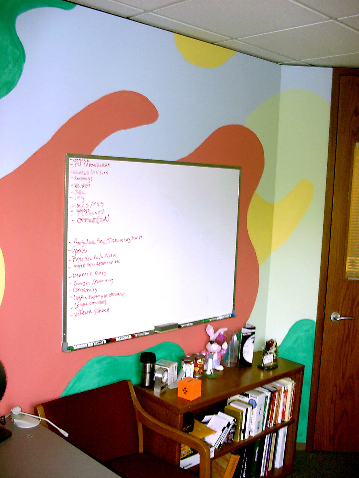 A white board for planning and seven years of trophies on the bookshelf