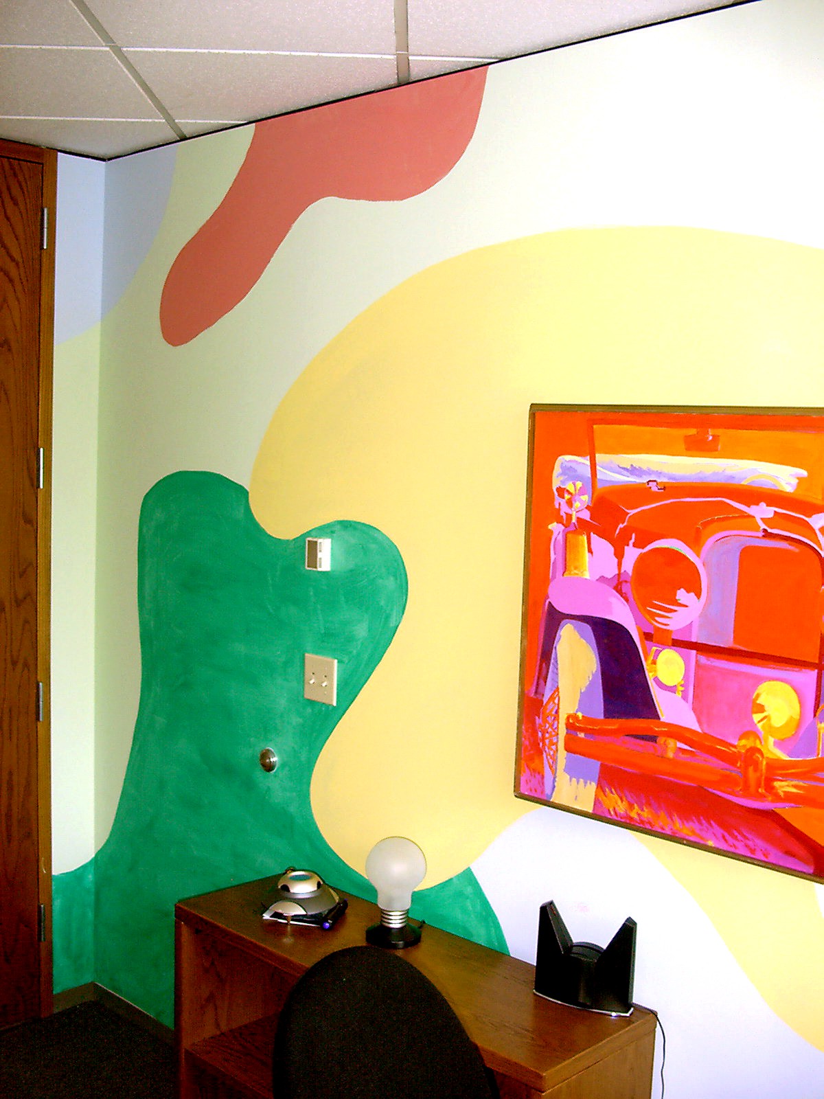 Colorful shapes playfully hide behind the door