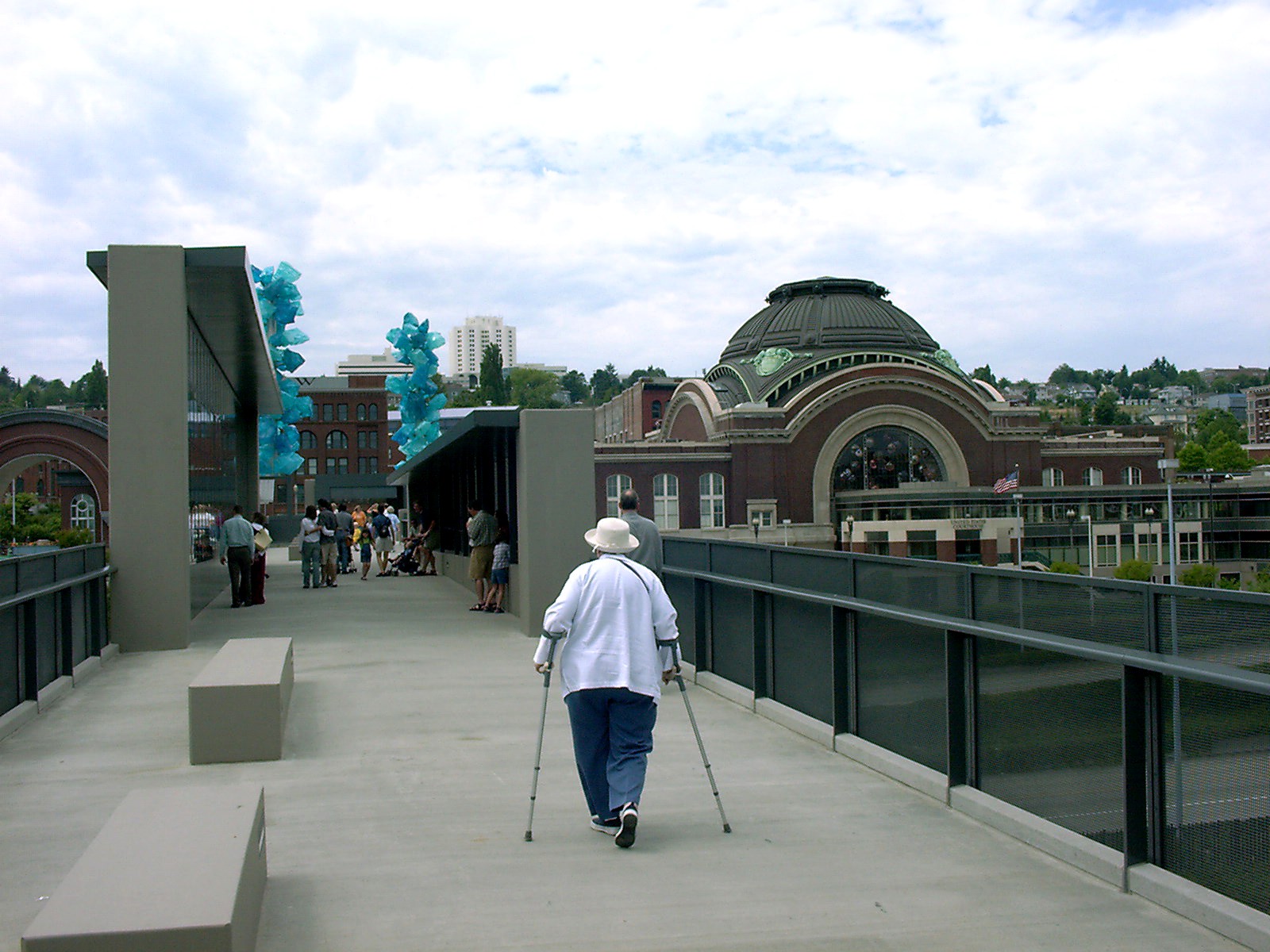 Joan heads over the Chihuly Bridge of Glass. Historic Union Station, seen in the background, is also the site of a major Chihuly installation.